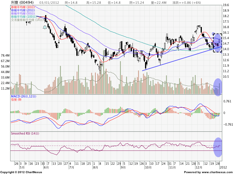 配合內地股市回升,港股再現強勢。上證指數全日升 34點,收報 2504點,明顯出現雙底突破的訊號。至於港股,仍處於大漲小回的上升趨勢,跟 10月中的模式一樣,急升後調整約 1000點便再上。而且,昨日上午跌市的成交不足 300億元,下午升市的成交逾 400億元,又是升市成交大,買盤頗為積極。